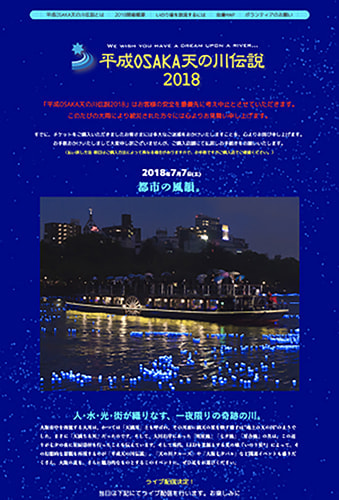 2009年からスタートした大阪の夏の風物詩、平成OSAKA天の川伝説。告知だけでなく、現場での緊急対応などWEBサイトの担う役割は重要です。2016年からは、実況中継もTOPページで行うようになりました。