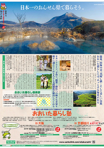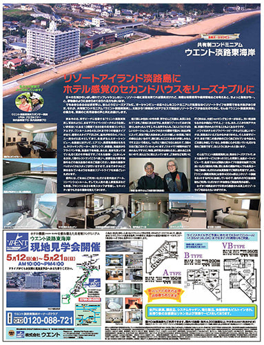淡路島の会員制リゾートマンションWENTの素晴らしさをオーナー様の生の声で語る新聞全頁企画広告。新聞社企画・制作のクレジットにより信憑性を高め、さらに全面写真により立地の素晴らしさを表現しています。