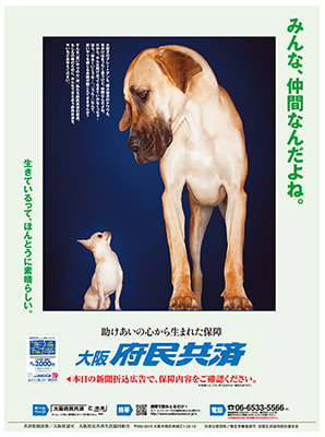 共済保険のメリットと相互扶助の概念を親しみやすい動物のビジュアルで表現。インパクトのある写真が話題となりました。