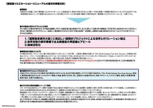 大阪の冬の風物詩として、イルミネーション・イベントをプロデュース。国際集客都市としてのコンテンツ不足を痛感していたこともあり、中之島公園を中心としたにぎわいイベントの創出と、民間の参加を促す手法を総合プロデュース。世界の主要都市に贈られるノルウェーの『愛と平和と友好のシンボル』ツリーを日本で初めて誘致しました。